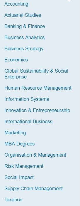 虽然上面几个专业不再招生,UNSW商科还有很多其他专业是我们可以选择的,UNSW商学院涵盖了会计、银行与金融、商业分析、经济、信息系统等近20个研究领域:
