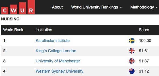 上图是世界大学排名中心(The Center for World University Rankings,CWUR)发布的专业排名(Rankings by Subject)的护理专业世界排名,按各大学发表在主要期刊上的研究文章数量为依据,比较了全世界26000多个高等教育机构的研究出版物。从权威的CWUR排名看,有两点解释了为什么西悉尼大学护理学位紧张。