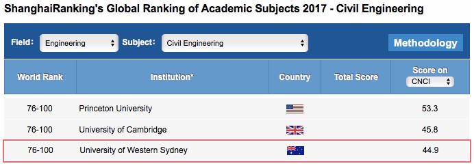 西悉尼大学的土木工程,位列世界第76-100,与美国普林斯顿大学,英国剑桥大学的土木工程同属一档。