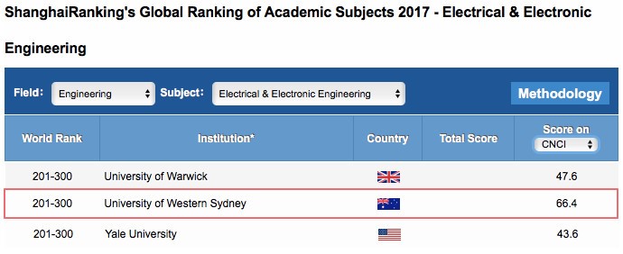 在权威的ARWU世界大学学术排名,西悉尼大学工程专业里面的土木工程和电子电气工程都获得了不错的世界排名,不输于传统英美名校。