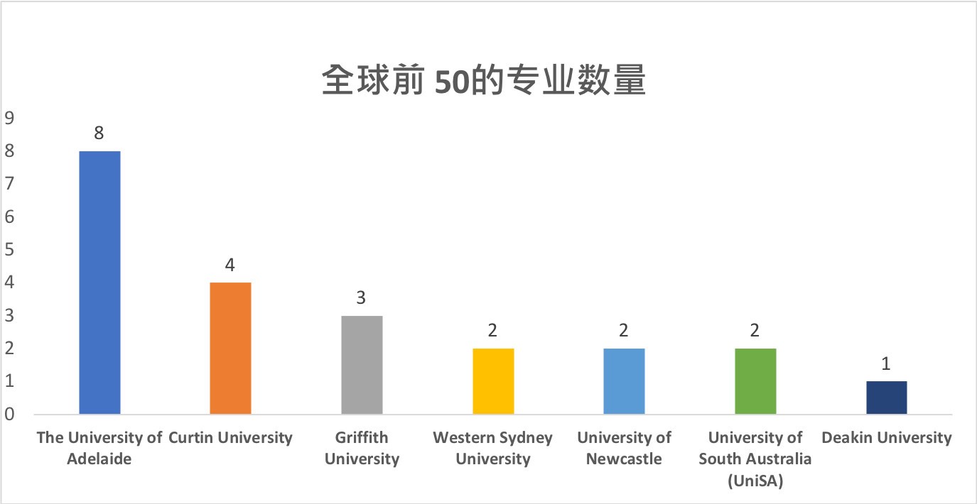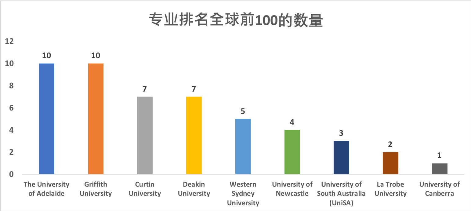 由上图可见,尽管格里菲斯大学Griffith University还不是“八大”的成员,但是其全球排名前100的专业数量跟阿德莱德大学是一样的。