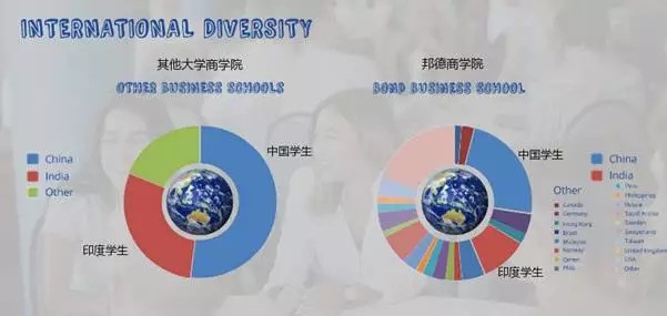 和其他大学的商学院比较,邦德大学中国学生和印度学生的比例更小,让中国学生真正体验国际化的教育(参见下图,蓝色为中国学生比重,红色为印度学生比重,右图是邦德商学院学生比例)。
