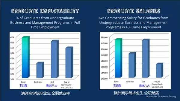 从图中可以看出,无论是就业率,还是全职起薪,邦德商学院毕业生都高于澳洲大学平均水平,也高于澳洲八校联盟。