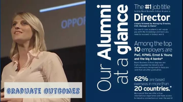 根据下图,邦德大学商学院毕业生职业走向,排名第一的商业总监(Director),紧接着的是,总经理(Managing Director),CEO,经理 (Manager)& 私人企业业主 (Owner)。