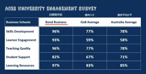 在澳大利亚教育研究委员会 (the Australian Council for Educational Research)的学生调查中,邦德大学的商学院在“技能提升”、“师生互动”、“教学质量”、“学生服务与支持”和“教学资源”方面的表现优于澳洲其它排名靠前的澳洲八校联盟(参见下图)。