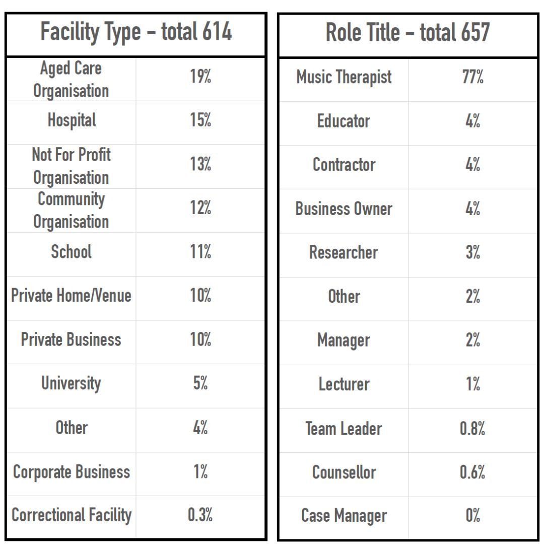 以下是澳洲音乐治疗协会2016年大数据统计的音疗师工作场所和职业头衔类别。
