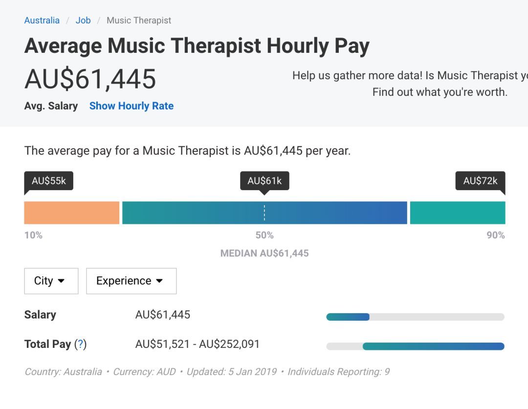 从薪资的角度来说,音乐治疗师的收入也有很大的上升空间,目前在澳洲,音疗师平均年薪在$61445左右,这个数字根据治疗师经验可上升至$252091。