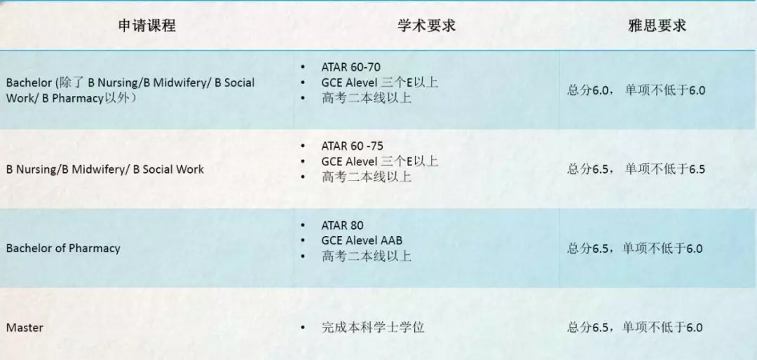 1、可以注册的课程:4年制的Bachelor of education和2年制的Master of Teaching(early childhood, Primary, Secondary)6.5(6.0)的的雅思要求,可以配语言,最低配语言要求5.5(写作5.5,其他5.0),最多可以配20周语言。