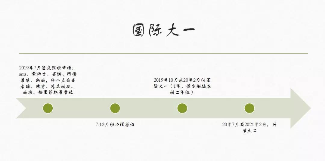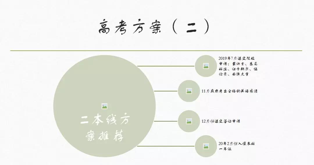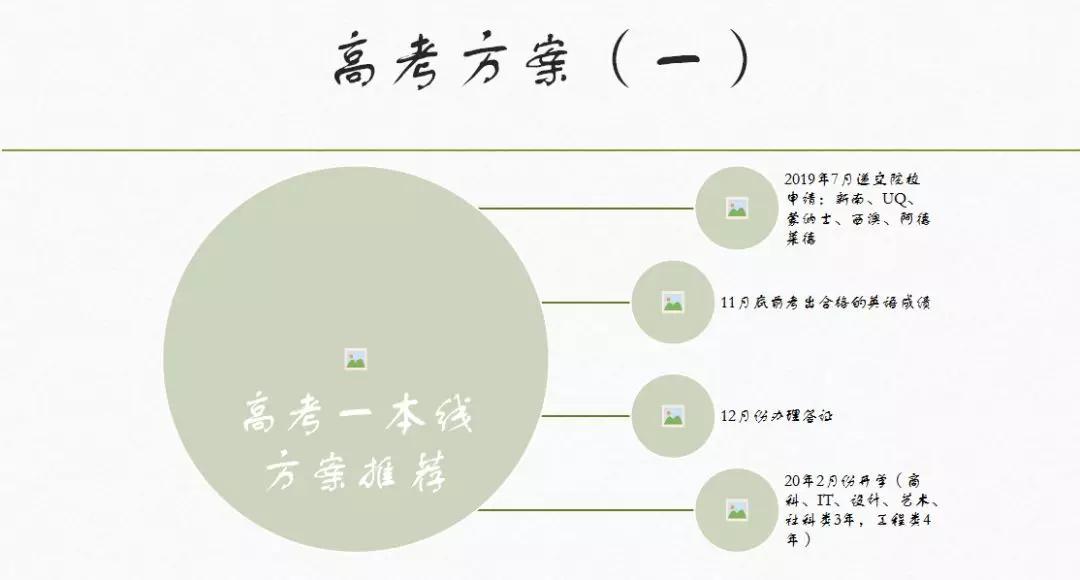 高考一本线方案推荐:2019年6、7月递交院校申请:新南、UQ、蒙纳士、西澳、阿德莱德等, 11月底前考出合格的英语成绩,12月份办理签证。20年2月份开学(商科、IT、设计、艺术、社科类3年,工程类4年)