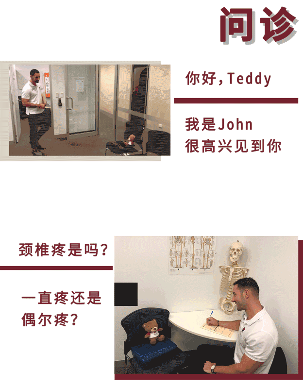 John根据Teddy在登记表上的信息,通过详细的检查,评估了Teddy颈椎的疼痛情况,并用模型和X光片解释了Teddy颈椎疼的原因,最后请他的supervisor(导师)复核诊断。为了确保诊断的准确性,在实习期间学生做的所有诊断都需要 supervisor 进行复核。复核结束且准确后,就要进入Teddy最期待的治疗环节啦!