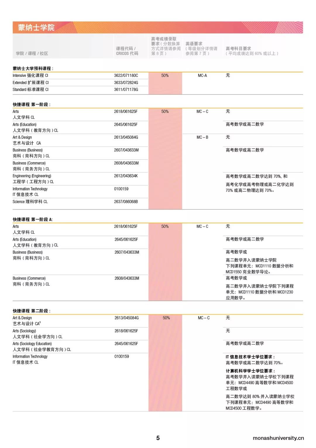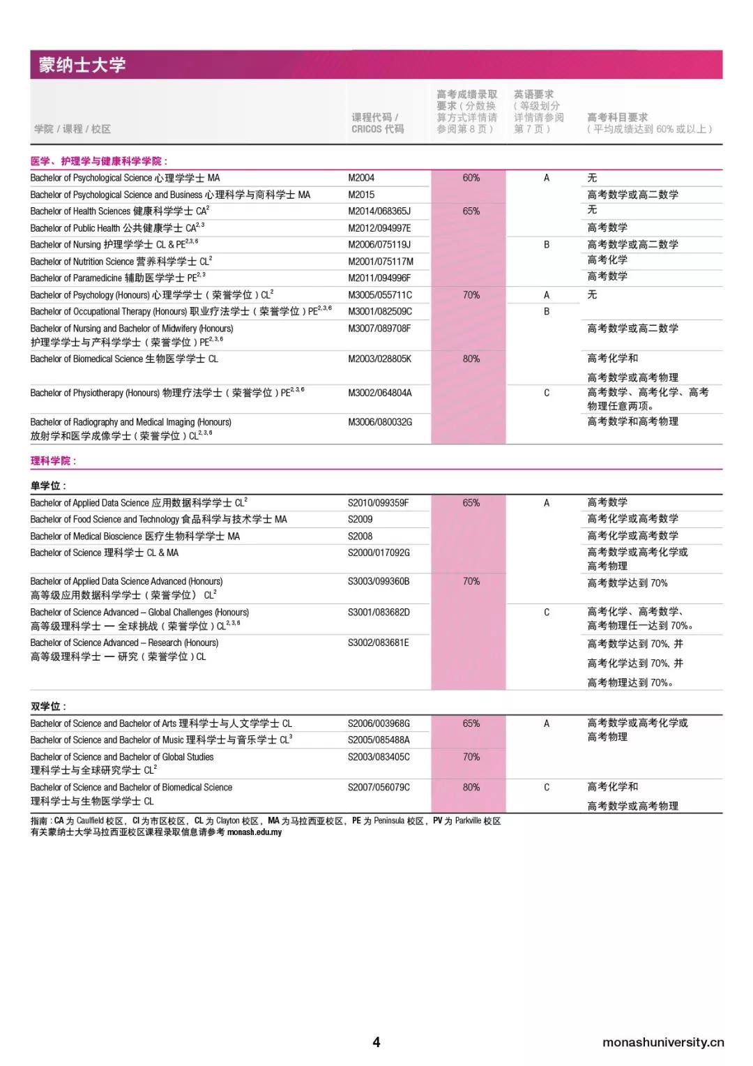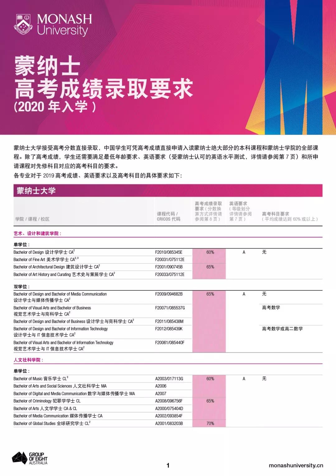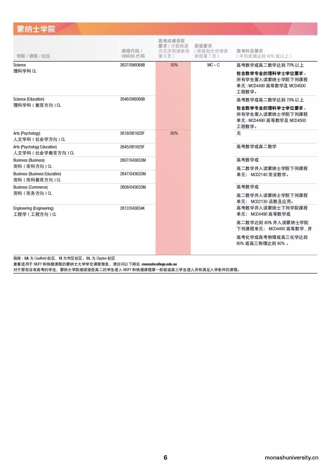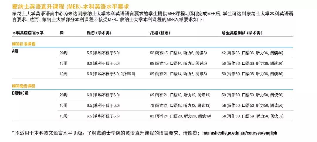 除了达到高考学术录取分数外,所有学生还须满足所选蒙纳士大学本科学士学位课程的先修科目和其他入学要求。关于蒙纳士大学各院系和蒙纳士学院录取高考分数要求,具体高考科目要求,以及英语要求如下图所示:
