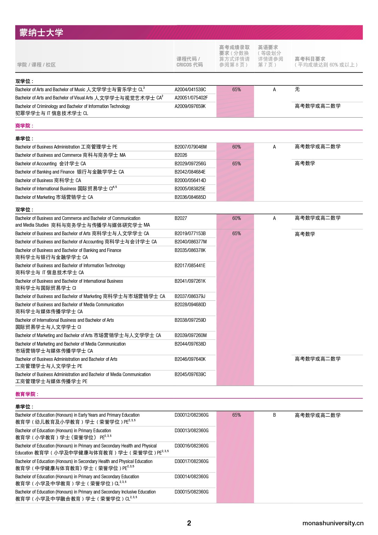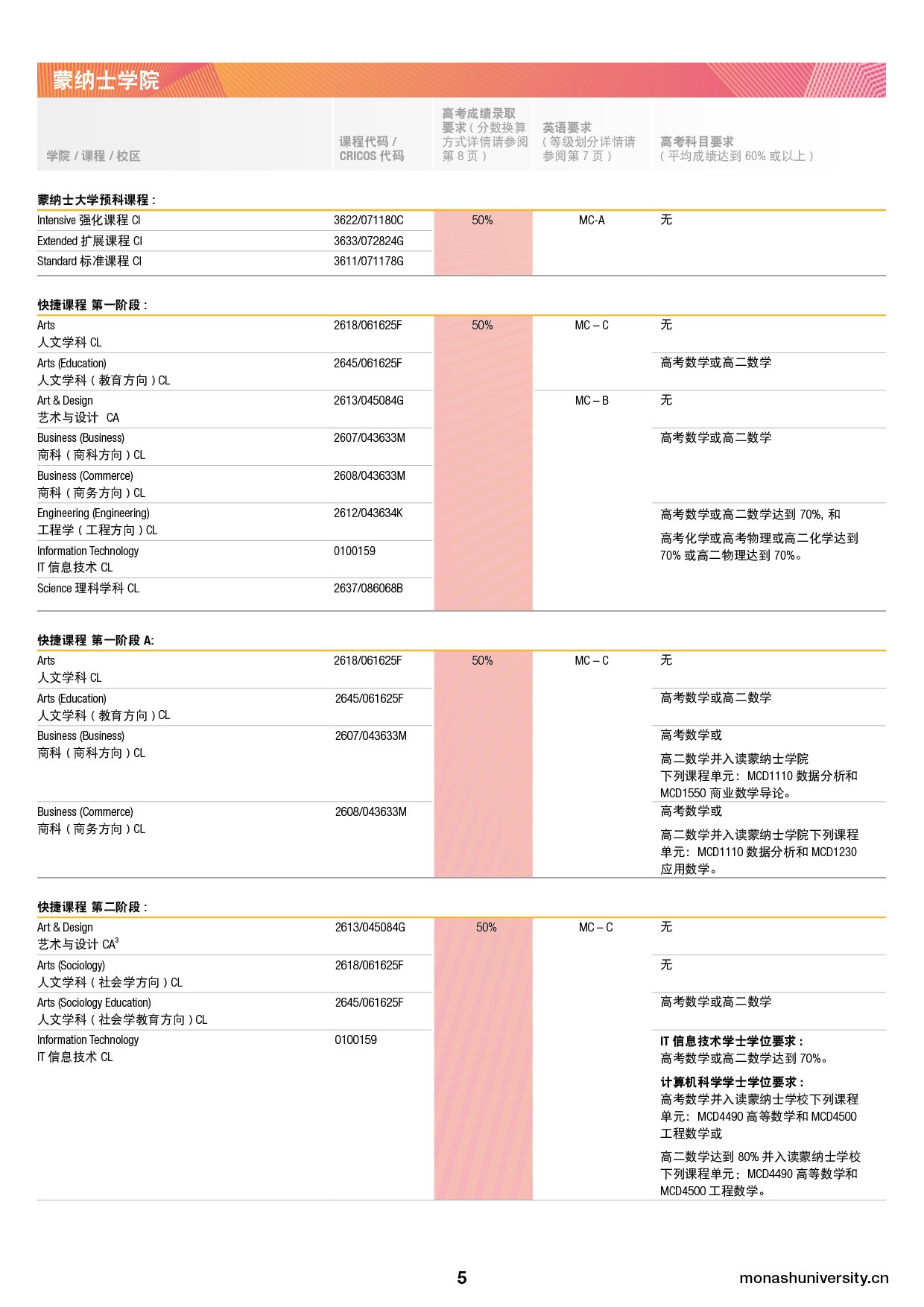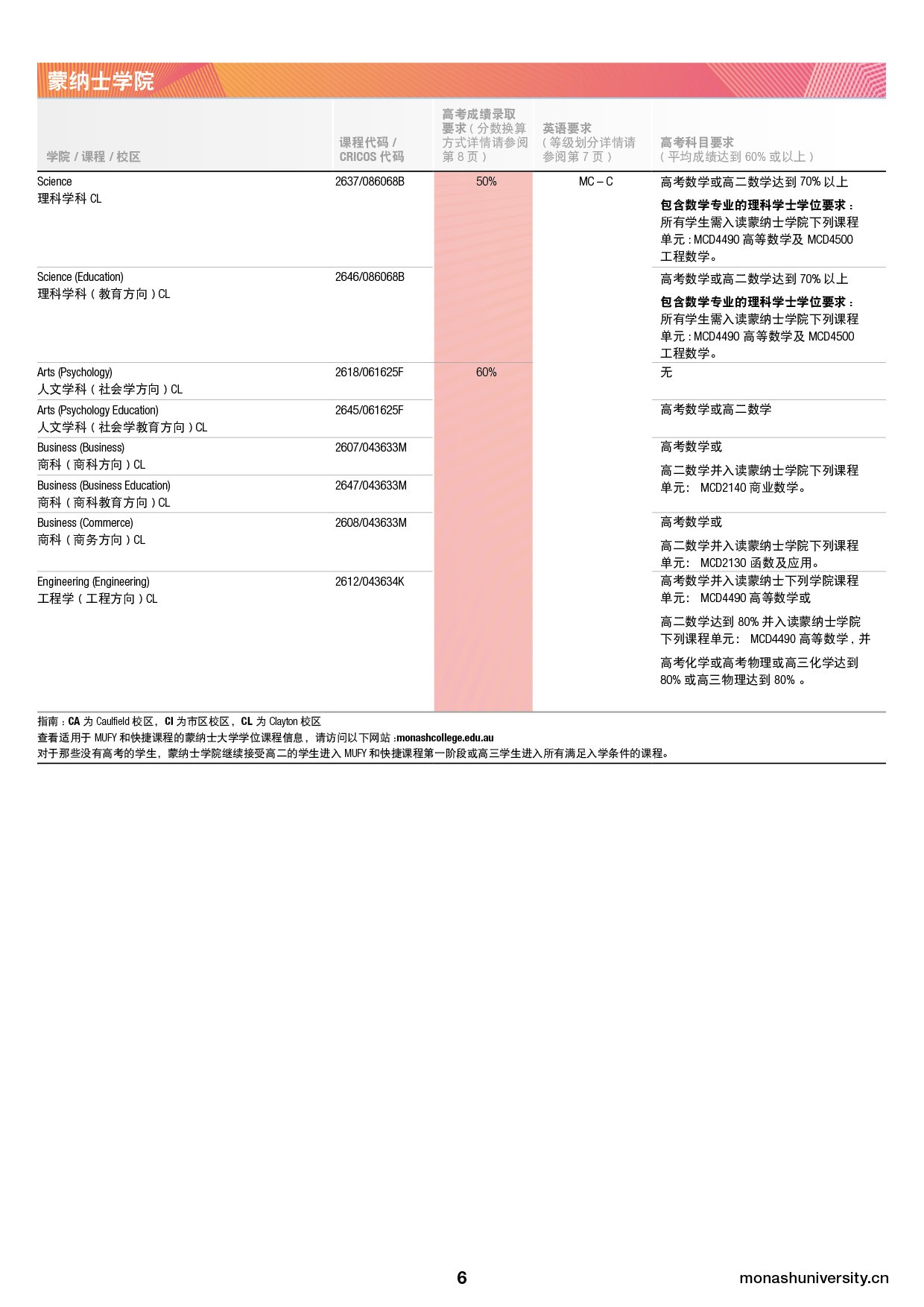 所有学生必须提供由中国各省级考试机关颁发的最终全国高等教育入学考试(高考)成绩,以便蒙纳士大学/蒙纳士学院确定您是否满足录取要求。蒙纳士对于高考成绩的具体换算方式如下所示: