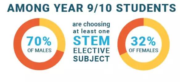 70%的9~10年级男生至少选择了一门STEM选修课,而仅有32%的女生至少选择了一门。