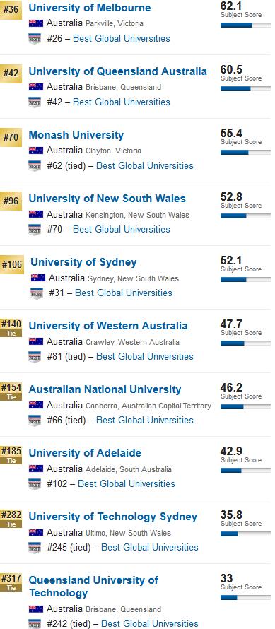 2019U.S.News澳洲大学生物与生物化学专业排名