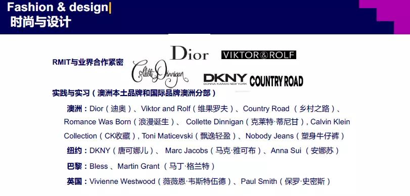 就业前景:毕业生在全球时尚行业的各个方面工作,如迪奥(Dior)、路易威登(Louis Vuitton)、卡尔文•克莱因 (Calvin Klein)、维克多(Viktor)和罗尔夫(Rolf)等品牌,或者创立自己的独立品牌