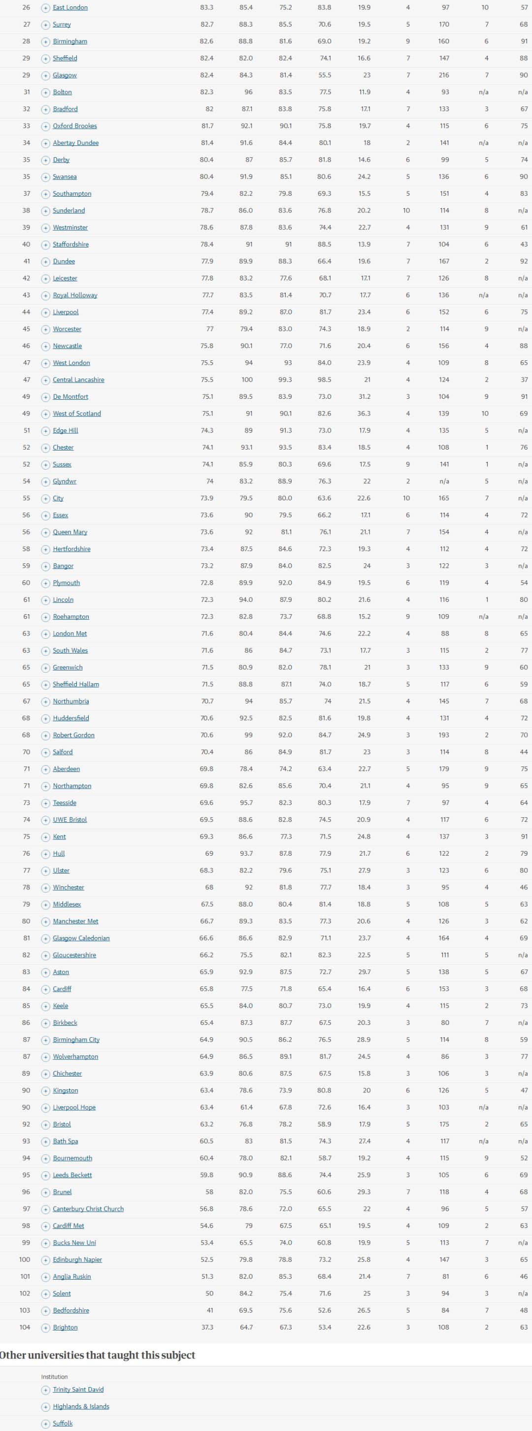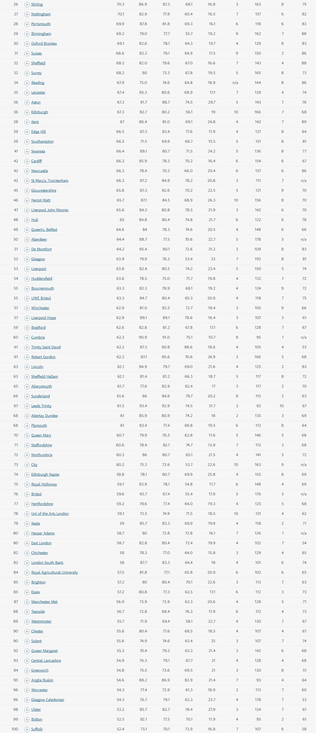 下降比较明显的大学,还有萨里大学(9→27);格拉斯哥大学(10→29);