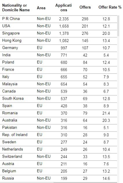 牛津本科发放录取比例地区统计