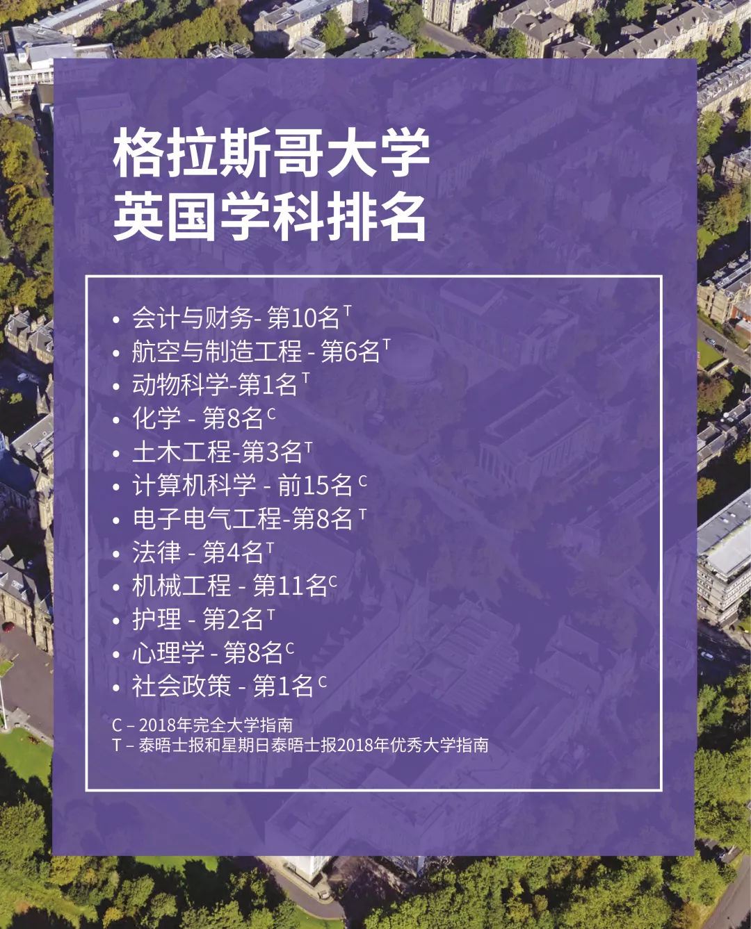 根据2018年完全大学指南(Complete University Guide 2018)和2018年泰晤士报与星期日泰晤士报2018年优秀大学指南(Times and Sunday Times Good University Guide 2018),格拉斯哥很多专业排名都名列前茅。