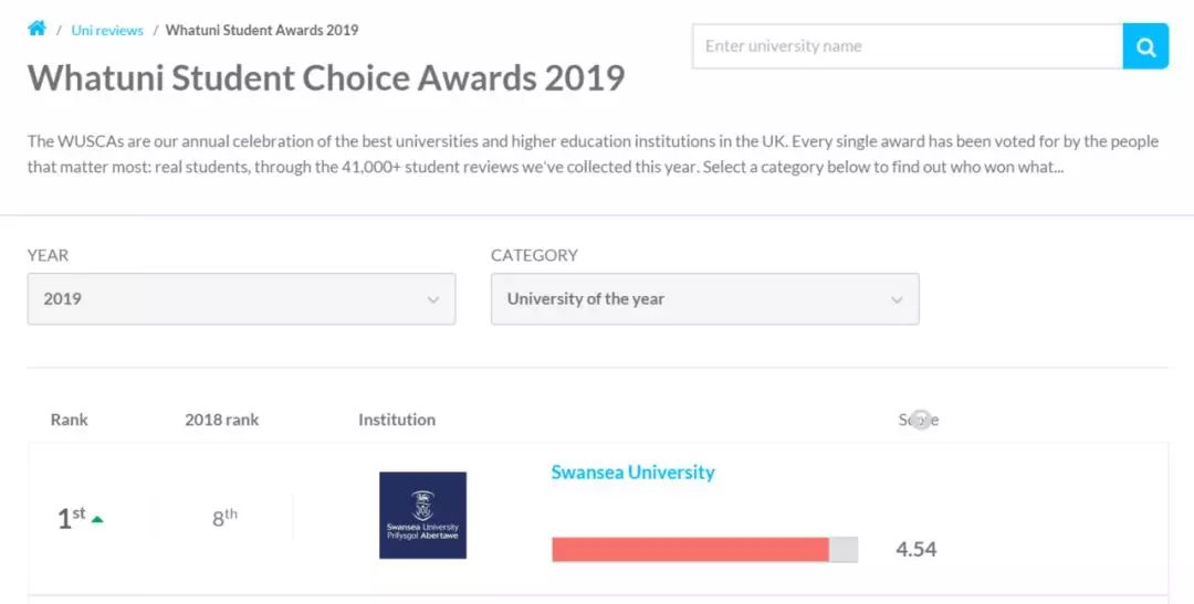 今年是WUSCA奖的第6届,而这是斯旺西大学近5年来第2次登顶Whatuni年度最佳大学!