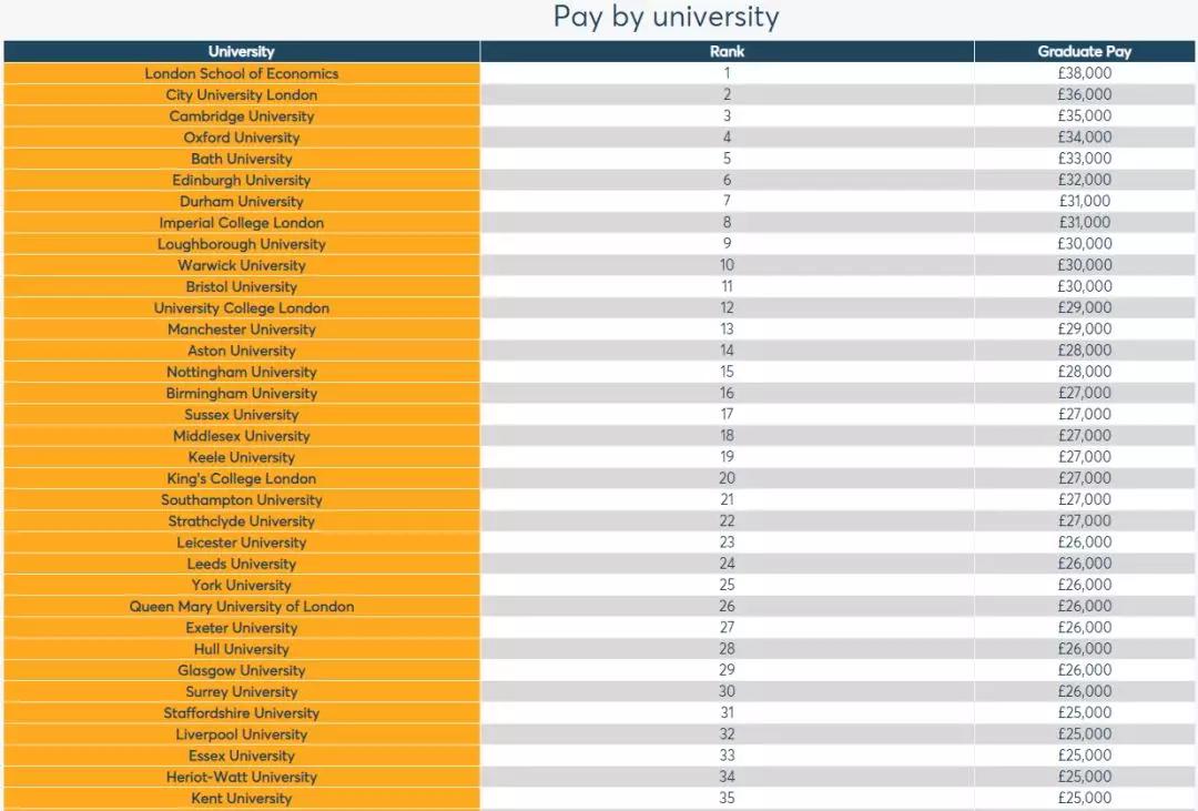 G5的学校还是实力不菲,LSE排名第一,剑桥和牛津分别为第三第四,帝国理工和UCL稍弱。伦敦大学城市学院表现也太优异了吧!仅次于LSE,完胜另外四所G5学校。巴斯大学和拉夫堡大学表现也很好,与世界前100的学校竞争也毫不逊色,毕业生薪资都排在英国前十。一些世界综合排名稍弱,但是在就业薪资这块表现良好的学校分别都有Aston(14), Sussex(17), Middlesex(18), Keele(19), Strathclyde(22), Leicester(23), Hull(28), Surrey(30), Staffordshire(31), Heriot-Watt(34)和Kent(35)。
