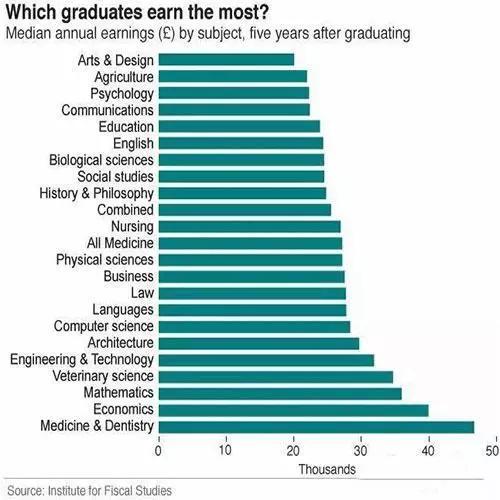 而那些文创、传媒和社会关怀类的学生在毕业后的五年内赚得最少,大约2万英镑。