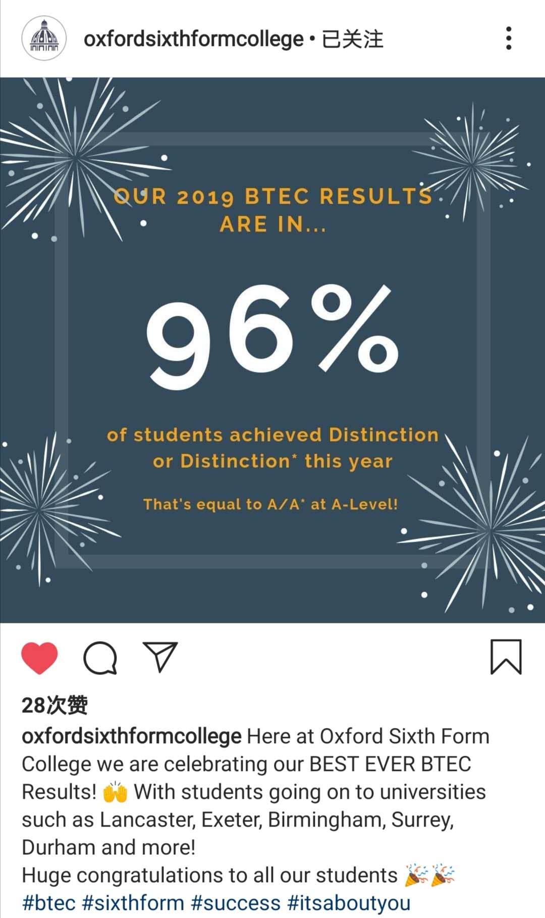 · 2017 年,64%的学生收到牛津、剑桥、伦敦帝国理工学院等罗素大学集团院校的录取通知书;2018 年,A-level 成绩 A*-A 达到 30%以上,BTEC 成绩达到 D*-D 优秀等级达到 83%;