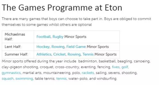 “体育的本质是人格教育”这句话在伊顿公学中得到了最好的诠释。伊顿每周体育课的学习和训练的时间长达23小时,差不多占据了学生一半的时间。体育课是怎么设置的呢?