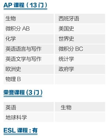 同时,学校提供AP课程和荣誉课程: